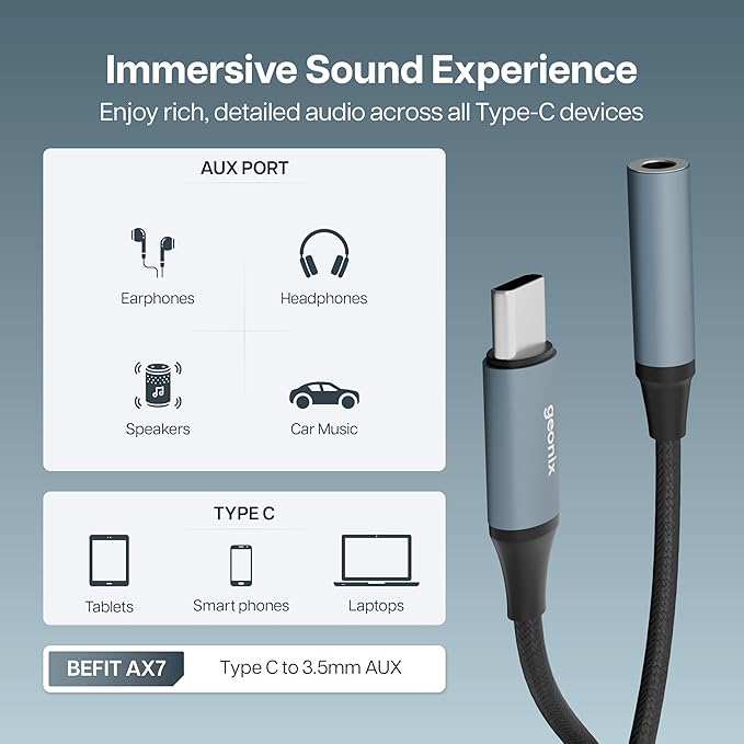 - Universal Type-C to AUX Compatibility: Effortlessly connects any USB Type-C enabled device to 3.5mm audio peripherals such as headphones, speakers, car audio systems, and AUX-supported home stereos. Perfectly suited for modern smartphones, tablets, laptops, and more—especially useful for devices without built-in headphone jacks.