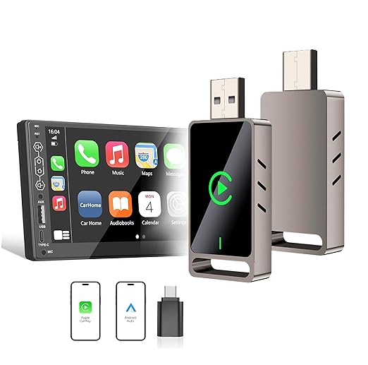- The 2-in-1 Wireless Adapter boasts a sleek, compact design that seamlessly integrates into your car’s interior. For easy setup, simply connect your iOS or Android phone to your factory-installed wired CarPlay or Android Auto system (compatible with car models from 2016 to 2025), plug the adapter into the Infotainment system’s USB port, and pair with your phone via WiFi Bluetooth for a flawless wireless experience.